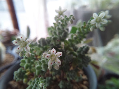 白い花にピンクの淡い筋が入って思いのほか綺麗なセダム花。