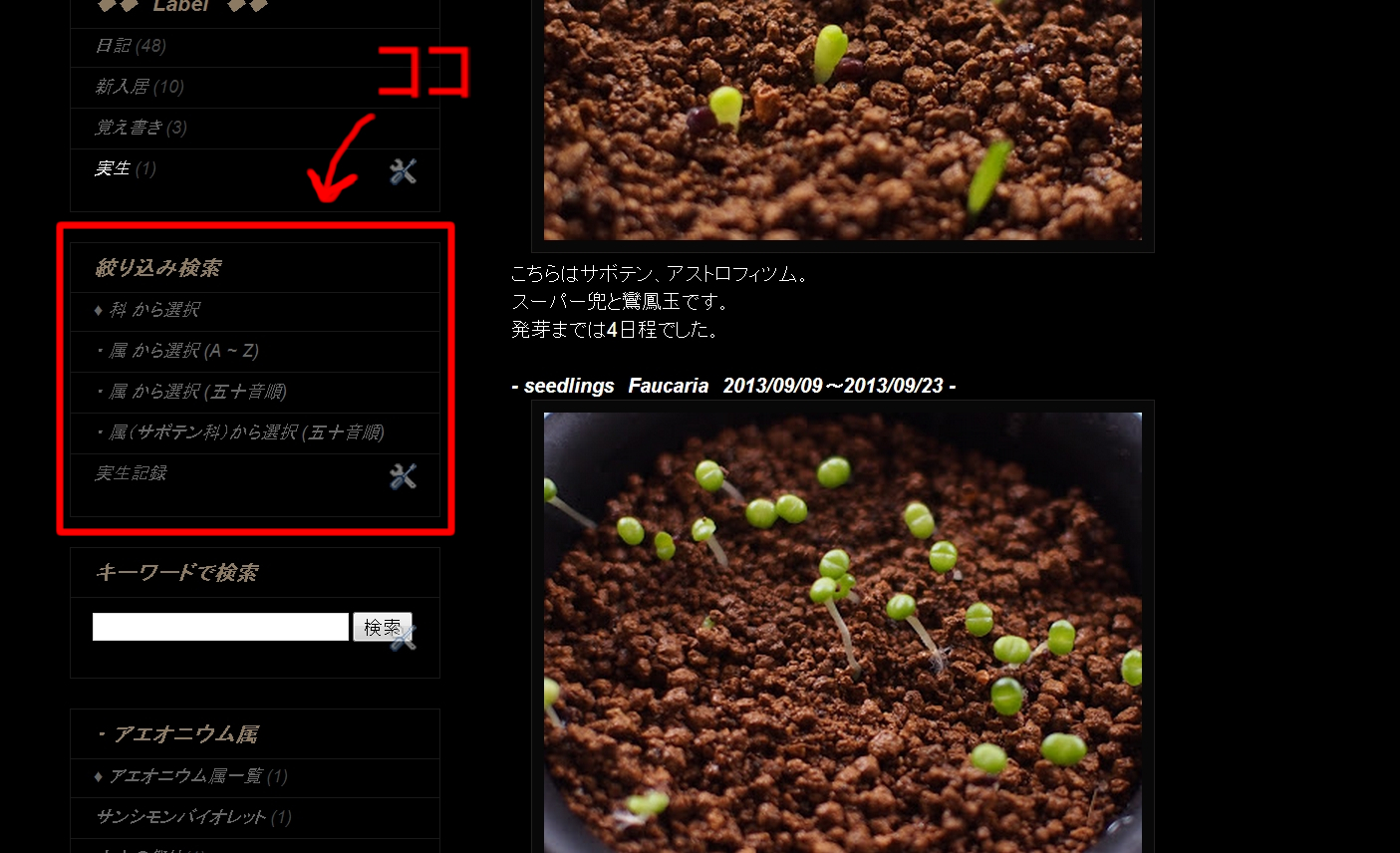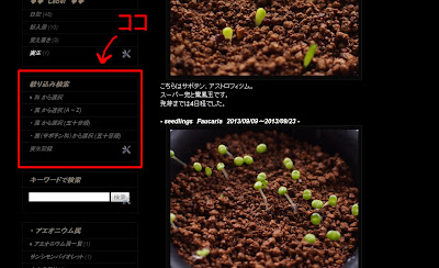 管理しやすく 9月 25, 2013 ROUKA 植物の管理をわかりやすくしようと、ブログをちょいちょいイジってみました。 左カラムに「絞り込み検索」を追加。ここから一覧を表示して、SucculentsページやCactusページに飛べるようにしてみました。 面倒臭かった。。。 Flowerページも削除して、ここに集約。代わりにOthersページにして、多肉植物意外をここにもってこようかな?最近増えつつあるブロメリアとか。 だいたいは土台が出来たんで、ボチボチ写真を追加していきます。 多分。。。