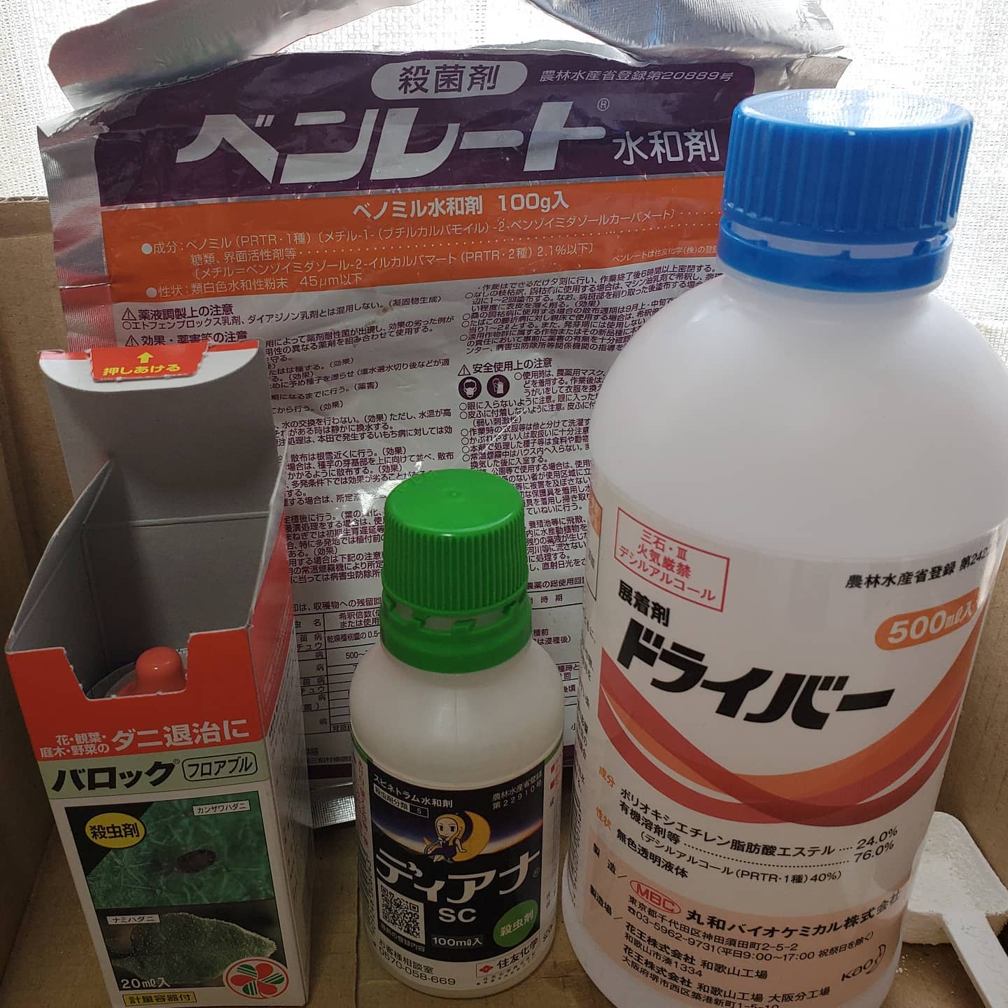薬散 7月 4, 2020 ROUKA おはようございます昨晩はこの組み合わせで薬散。 展着剤ドライバーを入れての薬散は2度目ですが、今のところ植物に問題も無くシミなども残らない印象。 葉にまとわりつくように濡れ広がるので無駄に散布しなくて済むのも良いかも。 アザミウマ対策にディアナSC、これは今回初めて使う。効果はどうかな? ハダニ対策にバロック。 殺菌剤はベンレート。まぁ定番。 ちなみにドライバー、ネットでまだあまり売ってませんがモノタロウで買えたりします 後は農協かな?