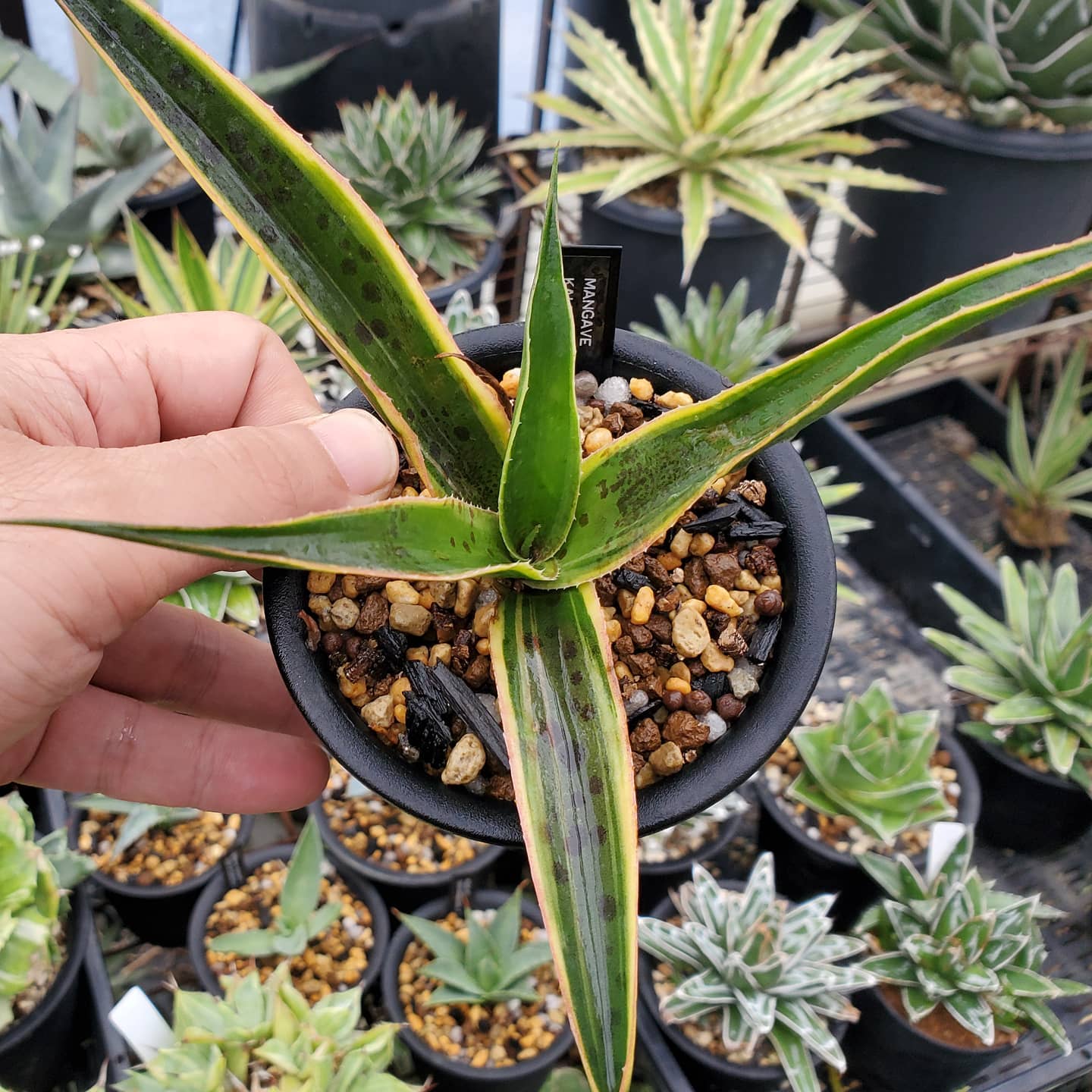 カレイドスコープ 7月 17, 2020 ROUKA ×マンガべ ‘カレイドスコープ’ カトー園芸 @katopin 産の苗 抜き苗で葉を閉じていたけど、根付いてエンジンかかった様子で葉が広がってきた様子。 派手な万華鏡に育って欲しい ×Mangave ‘Kaleidoscope’ ×マンガべ ’ジャガー’ (×Mangave ‘Jaguar’【Manfreda guttata × Agave sp. ?】)から出た斑入り種