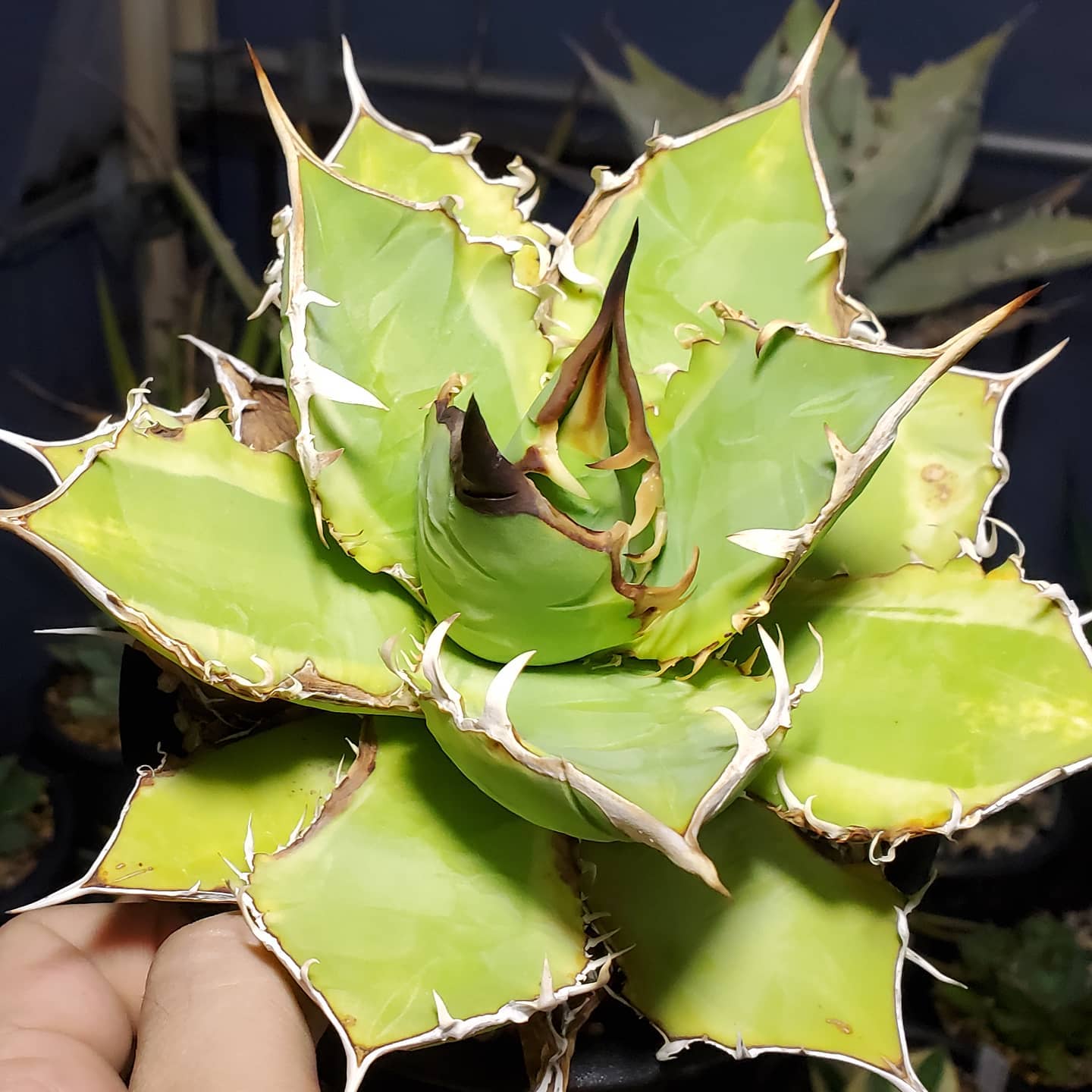 ティタノタ 黄覆輪これも去年植え替えて調子戻した株。新葉は綺麗に展開してるけど、傷んだ下葉は根詰まりからの葉焼けの跡。